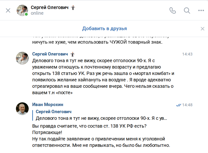 Уважаемый Иван Николаевич, Вы не правы! Человек не со зла! По недоразумению. Осознал. А Вы переписку сразу… личную… выкладывать на обозрение. Человек же говорит, что случайно воспользовался товарным знаком. И у него дел много, чтоб за копейки устраивать цирк… Иван Николаевич, ну, что Вы?! Пустое! Так подумали бы многие. Но, вот когда в дом заходят без приглашения, и еще «просят» уважения, становится «грустно»…