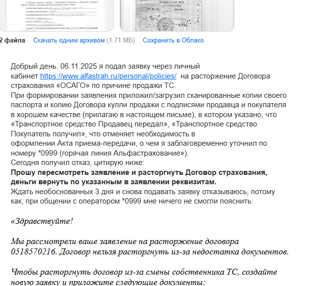 В ноябре продал свой автомобиль, решил расторгнуть страховку. Оформил заявление на сайте страхователя, приложил ДКП.