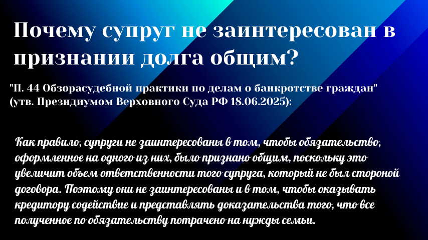 Из приведенного в рисунке фрагмента из п. 44 Обзора судебной практики по делам о банкротстве граждан (утв. Президиумом Верховного Суда РФ 18.06.2025) нетрудно увидеть, каков интерес супругов не признавать обязательство общим. Объясню на пальцах.
