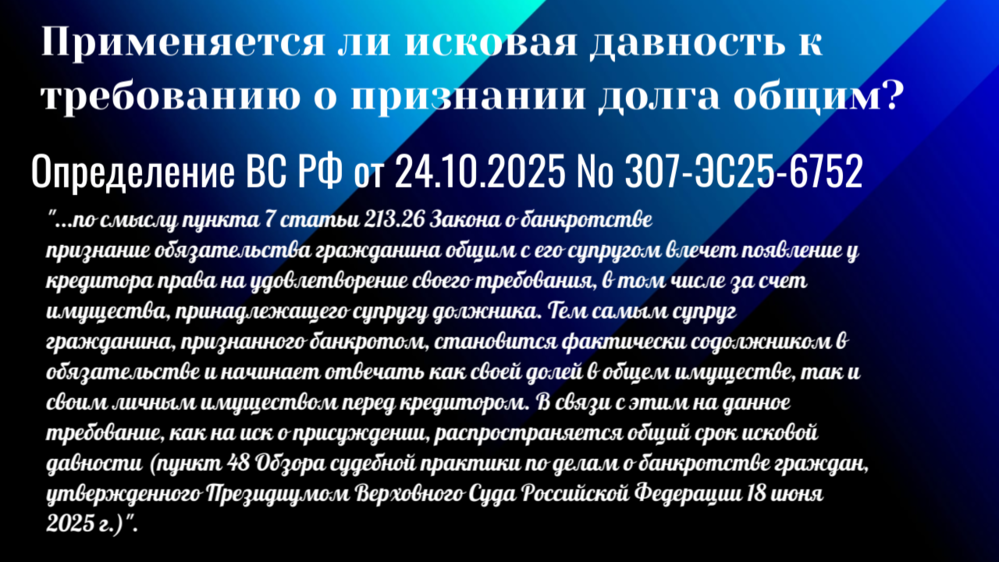 В то же время, по смыслу пункта 7 статьи 213.26 Закона о банкротстве признание обязательства гражданина общим с его супругом влечет появление у кредитора права на удовлетворение своего требования, в том числе за счет имущества, принадлежащего супругу должника. Тем самым супруг гражданина, признанного банкротом, становится фактически содолжником в обязательстве и начинает отвечать как своей долей в общем имуществе, так и своим личным имуществом перед кредитором. В связи с этим на данное требование, как на иск о присуждении, распространяется общий срок исковой давности (пункт 48 Обзора судебной практики по делам о банкротстве граждан, утвержденного Президиумом Верховного Суда Российской Федерации 18 июня 2025 г.)