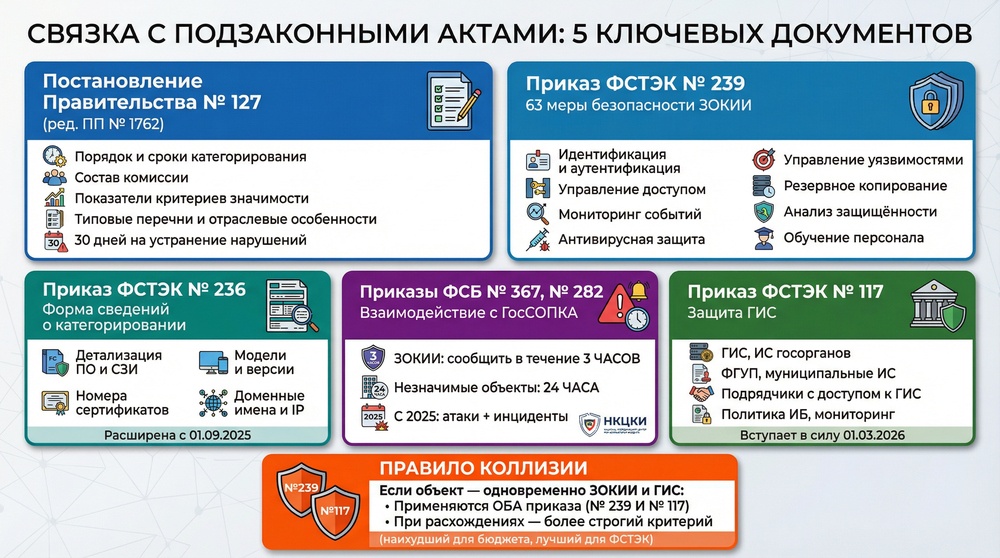 Если объект КИИ одновременно является ГИС (органы госвласти, госуправления), с 01.03.2026 параллельно применяется Приказ ФСТЭК №117 — новые требования к защите ГИС, включая работу с подрядчиками. Гармонизация требований №239 (КИИ) и №117 (ГИС) отсутствует — риск противоречивых трактовок при проверках.