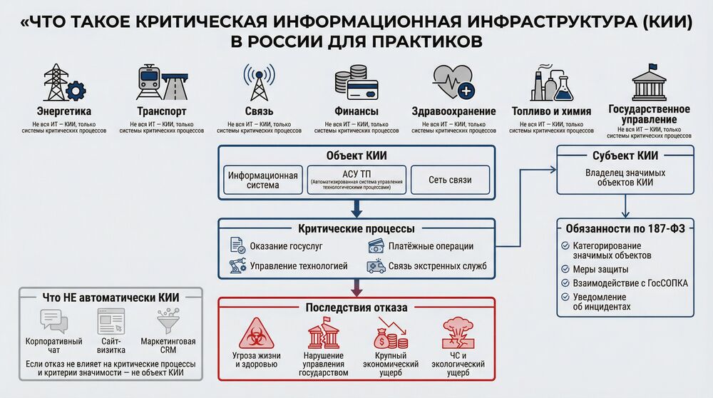 Объект КИИ — информационная система, ИТКС или АСУ, используемая для управления технологическими процессами либо оказания услуг/функций в сферах из перечня 187‑ФЗ (здравоохранение, транспорт, связь, финансы, ТЭК и т.п.).