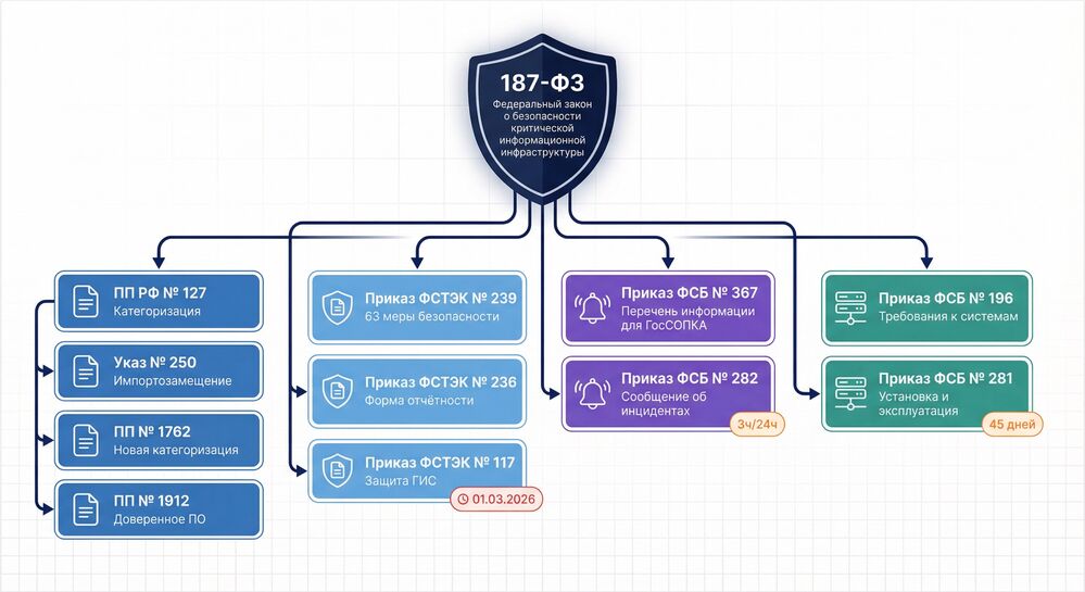 - Указ Президента РФ от 01.05.2022 №250 «О дополнительных мерах по обеспечению информационной безопасности Российской Федерации» задаёт надотраслевой, «над‑187‑ФЗ» режим для госсектора, системообразующих организаций и субъектов КИИ: усиливает требования к ИБ‑контуру, организационной структуре и происхождению средств защиты информации