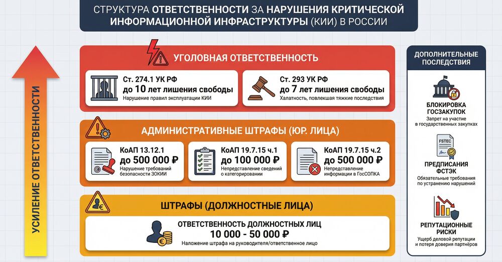 Попадание в контур КИИ автоматически включает юридический пакет: обязательное категорирование объектов, создание системы безопасности по 63 мерам Приказа ФСТЭК № 239, взаимодействие с ГосСОПКА, запрет на использование иностранных средств защиты информации, регулярные проверки ФСТЭК и административная ответственность до 500 тысяч рублей за нарушения. В особо тяжёлых случаях — уголовная ответственность по статье 274.1 УК РФ (до 10 лет лишения свободы).