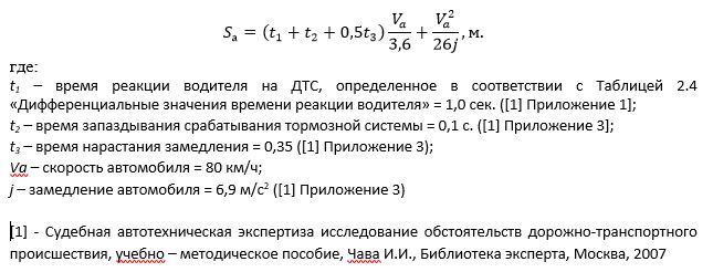 Большинству читателей дальнейшая последовательность расчетов знакома: авто эксперт должен сопоставить значение удаления 30 метров со значением остановочного пути автомобиля в сложившейся ДТС и в случае превышения последнего над первым следует вывод об отсутствии со стороны водителя автомобиля Toyota предотвратить столкновение, а, следовательно, отсутствие в его действиях причинно-следственной связи с ДТП. Формула по которой рассчитывается остановочный путь следующая (Глава 1, § 3.9, формула 9.1 [1]):