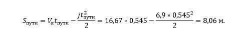 Перейдем к рассмотрению движения автомобиля Toyota. Остановочный путь состоит из двух фаз. Первая фаза (включает время реакции водителя на ДТС, время срабатывания тормозной системы и времени нарастания замедления) в совокупности равна 1,275 сек. За это время автомобиль проходит путь 16,67 м/с × 1,275 с = 21,3 м, продолжая движение с начальной скоростью. Оставшееся расстояние до места столкновения: