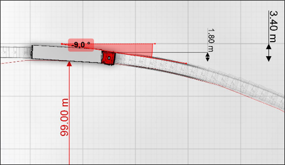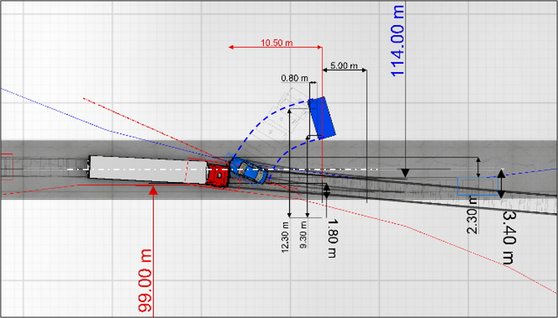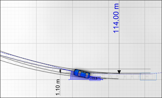 Аналогичный расчёт проводится и для второго участника — автопоезда. Если его водитель, как он указал, предпринял уклонение вправо, не теряя управления, то его манёвр должен укладываться в рамки критического радиуса для управляемого движения на скорости 84 км/ч (Rкр. ~ 99 м). Моделирование такого управляемого отклонения позволяет установить траекторию, с которой автопоезд подошёл к точке, отмеченного на схеме контакта.
