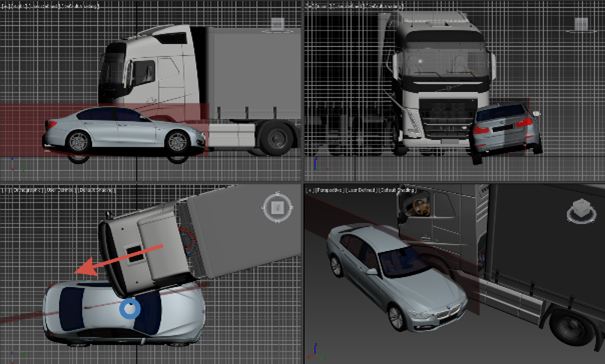 Анализ контактных пар: Эксперт выявляет соответствие вмятин на одном ТС и деформирующих элементов на другом. В рассматриваемом случае анализ показал, что левая передняя часть легкового автомобиля взаимодействовала с левой фронтальной зоной тягача.