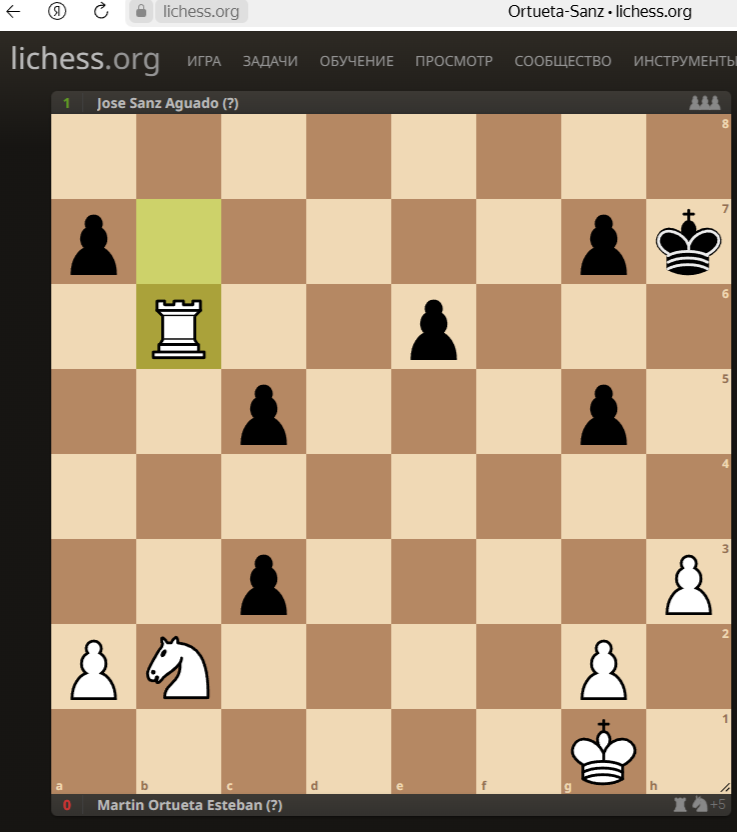 Уважаемый Юрий Борисович, Кр g7… Кр f6… Кр e5, и успеваем королём свою пешку, шагающую на c7, поддержать, или, в случае Кр b6, настигаем пешку h. Эндшпили со слоновыми пешками на седьмой горизонтали — теоретическая ничья. Точно не скажу, но это скорее всего этюд Рети. А с точки зрения победы духа над превосходящей материей самое мощное впечатление произвёл эндшпиль Ортуэта-Санс. Ход чёрных, и чёрные выигрывают.