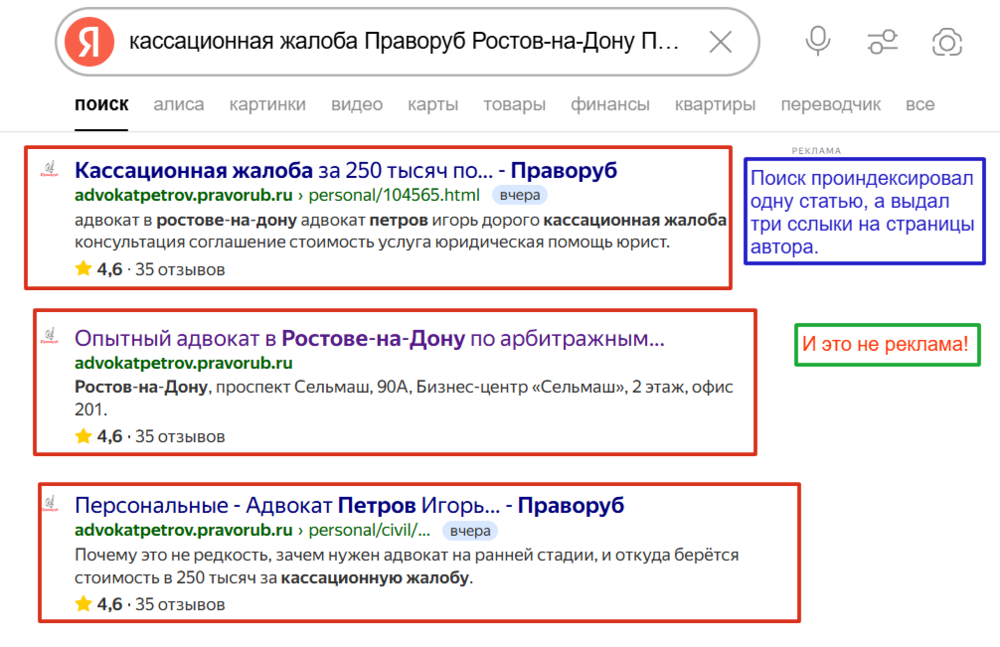 Эта статья сразу попала в выдачу Яндекса. Через несколько часов её уже читали не только коллеги, но и потенциальные клиенты. Потому что поисковик показывает свежие тексты по юридической теме. Особенно если автор — живой, активный и не прячется за инициалами.