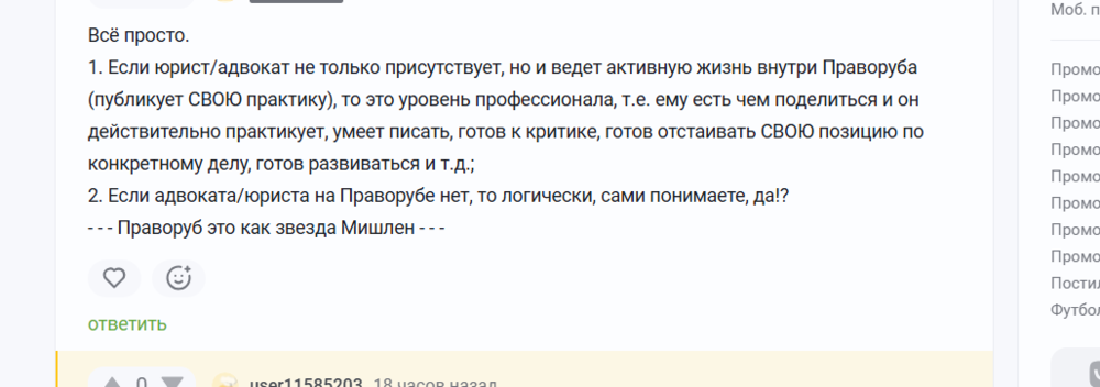 В итоге возникла ситуация несостыковки ожиданий и возможностей. Здесь нужно сказать честно и с уважением. Праворуб — это не рекламная платформа. Это профессиональное юридическое сообщество.