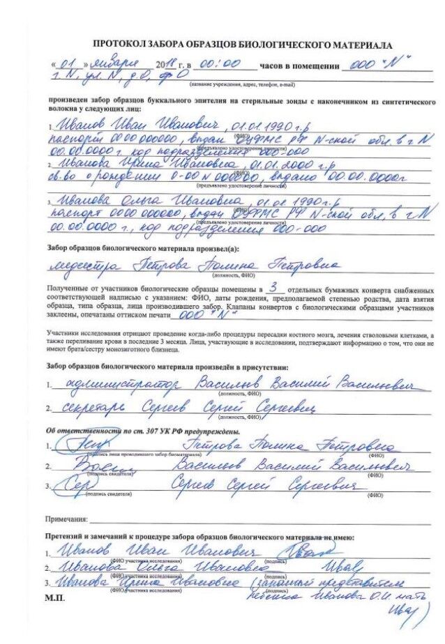 В данном документе указываются: дата, время, место проведения забора, данные участников из документов удостоверяющих личность, а так же: кем проведен забор, кто присутствовал при заборе, более того, лицо, проводившее забор биологического материала и лица, присутствующие при заборе предупреждаются об уголовной ответственности по ст. 307 УК РФ, как правило судом, о чем расписываются в протоколе.