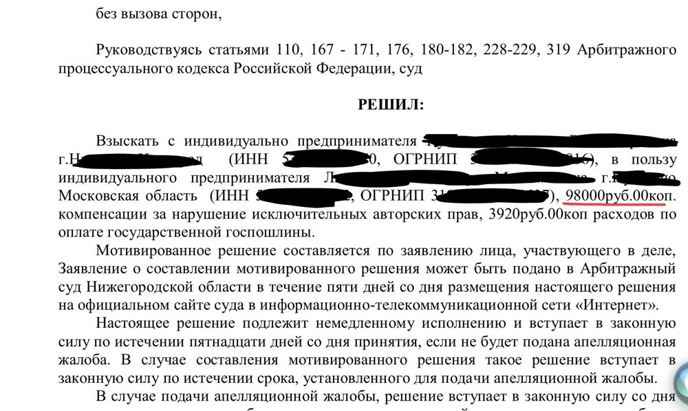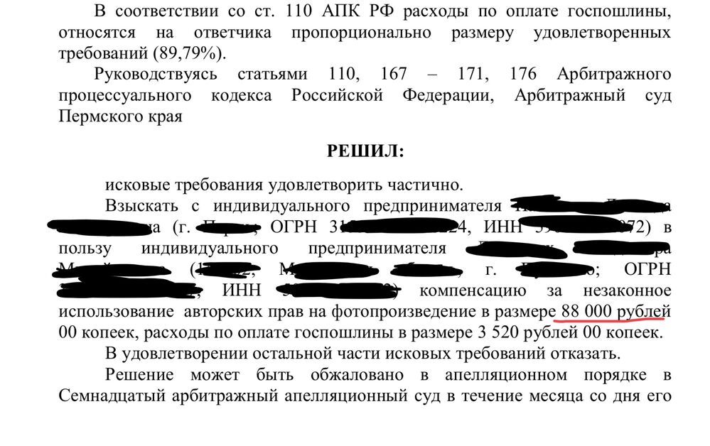 Уважаемая Ксения Евгеньевна, сумму брались логически обоснованные. Никто не заявлял миллионы — в этом нет смысла. Но за основу бралось — количество фотографий, время размещения, плюс прикладывали дипломы и награды с различных конкурсов для фотографов, обосновывая известность работ в определённых кругах.А моральный вред да, просто заявлялся в нагрузку.