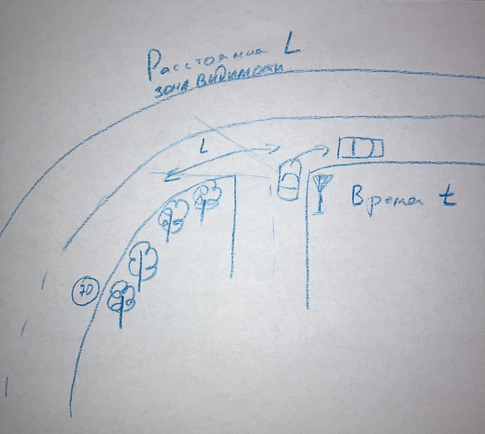 Как, например в прилагаемой схеме, лицо, выезжающее со второстепенной дороги имеет ограниченный обзор, когда при соблюдении водителем, движущимся по главной дороге требования знака 3.24. ПДД, водитель выезжающий со второстепенной дороги имеет возможность заблаговременно увидеть помеху и уступить дорогу, либо если помехи не видно, успеть закончить маневр за время «t».
