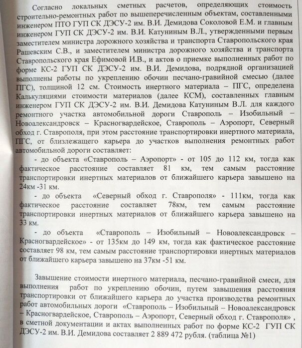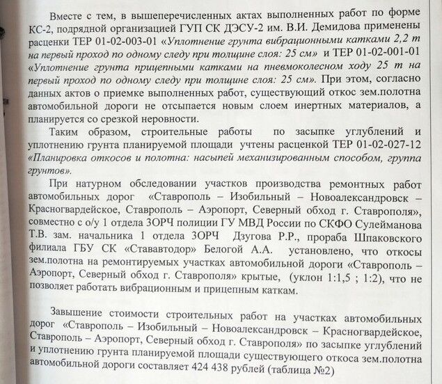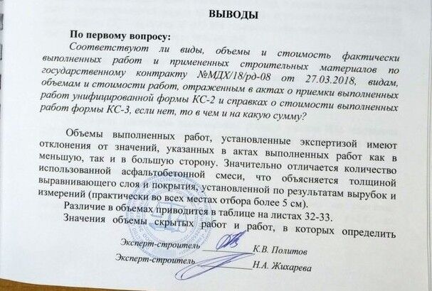 При этом в порядке экспертной инициативы эксперт выявил еще один источник возможного завышения объемов работ, а именно — наложение выравнивающего асфальтного слоя толщиной менее норматива (5 см) на меньшем по протяженности участке ремонта дороги (знаменитое «ужатие Лужкова» при строительстве МКАДа всё ещё не даёт покоя провинциальным расследователям :))