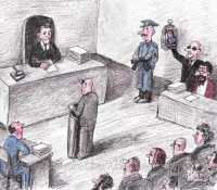 Свои рисунки лектор сопровождал комментариями, говоря о том, что завоеванием нового УПК РФ стал принцип состязательности сторон, сторона защиты противостоит стороне обвинения, а суд как независимый и беспристрастный арбитр со стороны наблюдает за поединком равноправных сторон и разрешает дело.