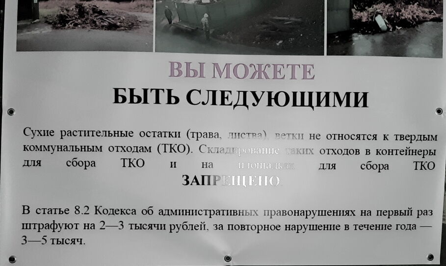 Поскольку сжигать все собранное, срезанное и спиленное, я считаю мероприятием вредным и опасным для здоровья, то с чистой совестью отвожу все это на ближайшую помойку, в чем, кстати, не одинок. И вот, доставив по месту разгрузки очередную партию того, что весной зеленело и расцветало, вижу вот такое объявление.