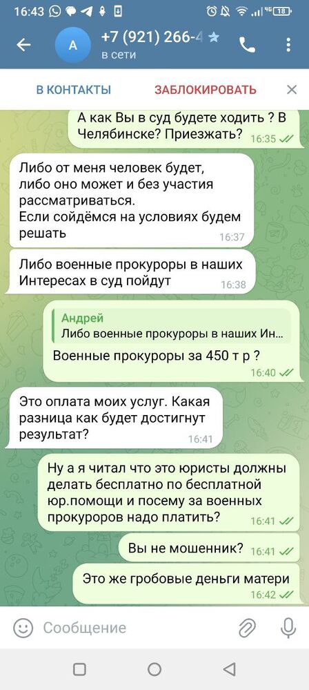 Уважаемый Евгений Алексеевич, в том то и дело то что он предлагает полностью обязанность командования части, военной прокуратуры и иных гос.органов. Но чтобы их активировать надо Серёже 450 Т.Р. пообещать. Мошенничества нет, но осадочные остался где то в подкорке.