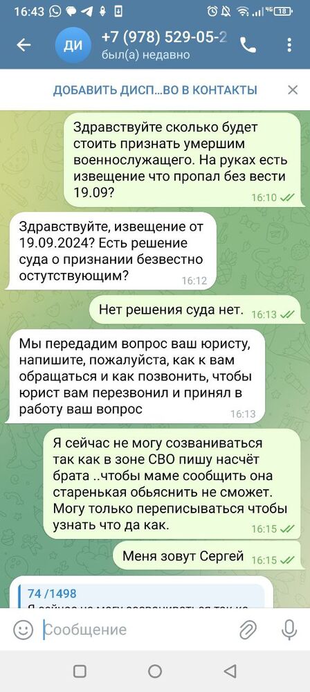 После бурного обсуждения коллегами моей предыдущей публикации Самовольное оставление части — «Вносим ясность и разоблачаем мифы» рассказывает практикующий адвокат , я решил провести определенный мониторинг ценовой политики юристов по наиболее частым вопросам, возникающим у военнослужащих и членов их семей. Как раз, в одной очень популярной группе около-юридического характера в мессенджере «ТЕЛЕГРАММ», наткнулся на рекламу «Диспетчерской военных юристов», назовем ее так. В публикации данная группа лиц активно предлагала услуги по признанию военнослужащего умершим ( без какой-либо ссылки о том, что это является рекламой и о том, кто ее заказчик и кто оказывает услугу).