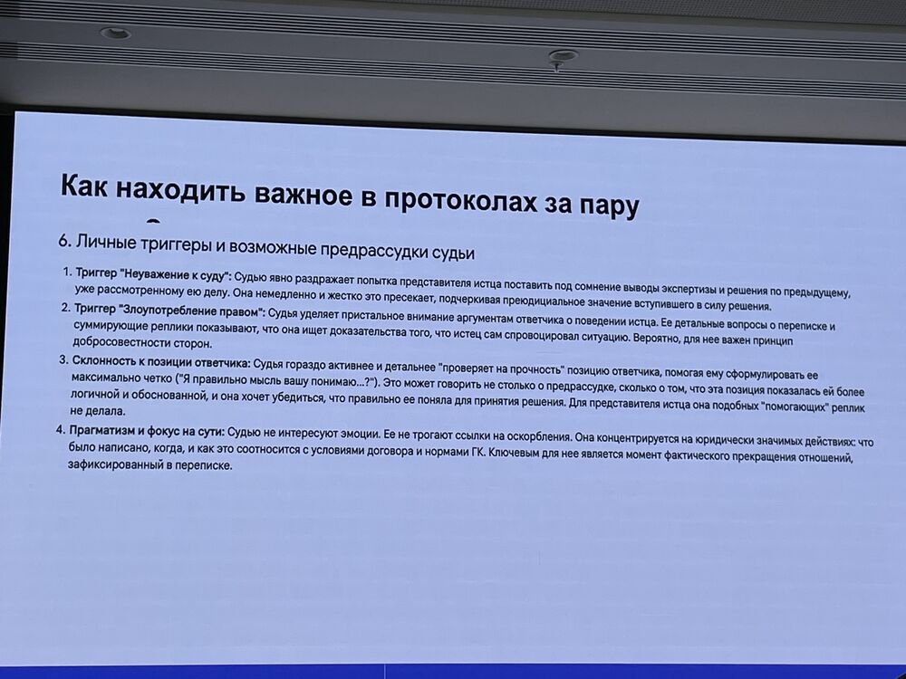Есть возможность проанализировать полученную расшифровку аудиозаписи с помощью нейросетей. Можно выявить ключевые позиции сторон, уклончивость ответов, противоречия в позиции оппонента. Можно провести анализ речевых паттернов, в том числе по вопросам судьи можно анализировать самого судью — выявить, что важнее всего для судьи в данном процессе, а также выявить и сформулировать предрассудки судьи.