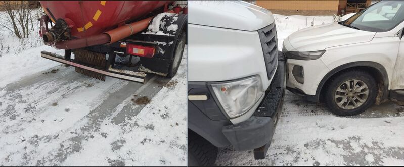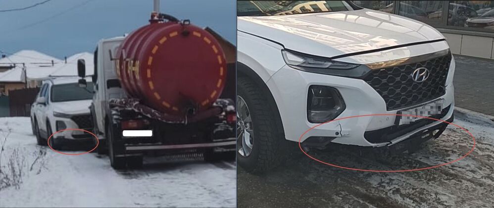 Уважаемый Илья Александрович, и всё же у меня такое чувство, что тут обоюдная вина, т.к. хундай находится прям на краю дороги и ему просто некуда деться в отличие от ГАЗ-ассенизатора. По механизму думаю, что тормозили оба, ГАЗ, кажется, два раза нажимал на тормоз (судя по тому, что два раза из под резиновой накладки вывалилась грязь). Какой автомобиль остановился первым? — Думаю, что Ваше исследование верное, тут явно ГАЗ стоял.