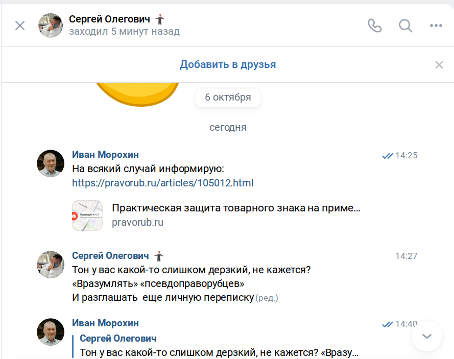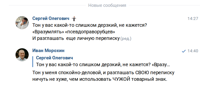 Уважаемый Иван Николаевич, Вы не правы! Человек не со зла! По недоразумению. Осознал. А Вы переписку сразу… личную… выкладывать на обозрение. Человек же говорит, что случайно воспользовался товарным знаком. И у него дел много, чтоб за копейки устраивать цирк… Иван Николаевич, ну, что Вы?! Пустое! Так подумали бы многие. Но, вот когда в дом заходят без приглашения, и еще «просят» уважения, становится «грустно»…