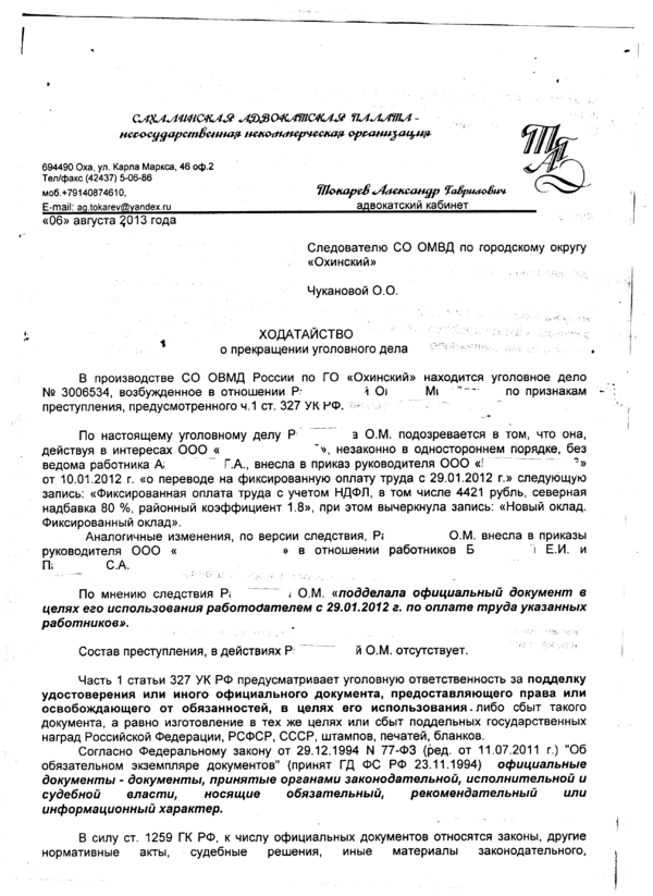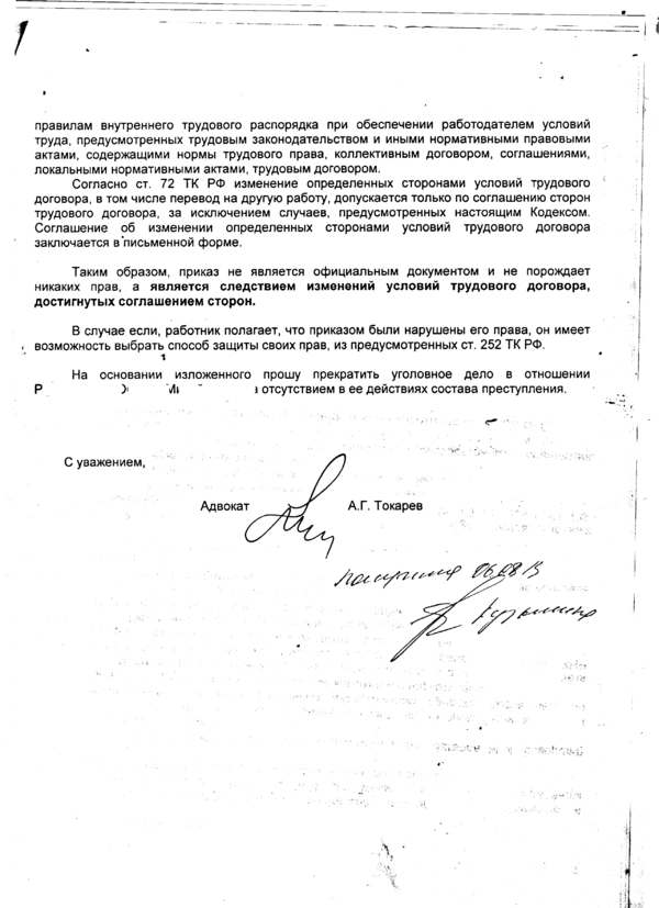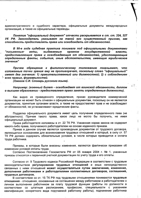Одно дело было возбуждено СО СУ СК по факту подделки подписи в трудовом соглашении и акте приеме-передачи выполненных работ. Доверитель был осужден. Приговор был отменен в кассации по жалобе адвоката. Причем кассация прямо указала на доводы адвоката о том, что указанные документы к официальным не относятся.