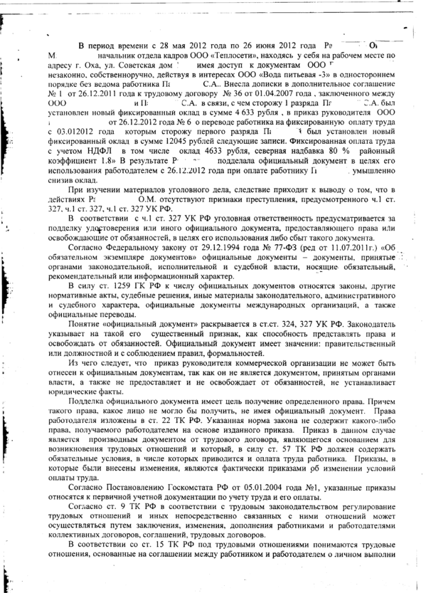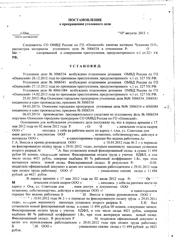 Очередные дела были возбуждены следователем СО ОМВД по факту внесения изменений в приказы о регулировании заработной платы работникам. Начальник отдела кадров внесла изменения в три приказа, в результате были возбуждены три уголовных дела, впоследствии соединены в одно производство.