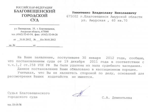 Третий отвод судье Дементьевой, который она спокойно выслушала и после этого удалила меня из процесса. Причем слово «психофизический кризис» она восприняла как указание на то что она больна. Прокуроша в приватной беседе сообщила, что они расценили это как указание на женские проблемы (???), на что я резонно сообщил, что если бы мне надо было скзать о «цыклах», я бы назвал кризис «психофизиологическим»