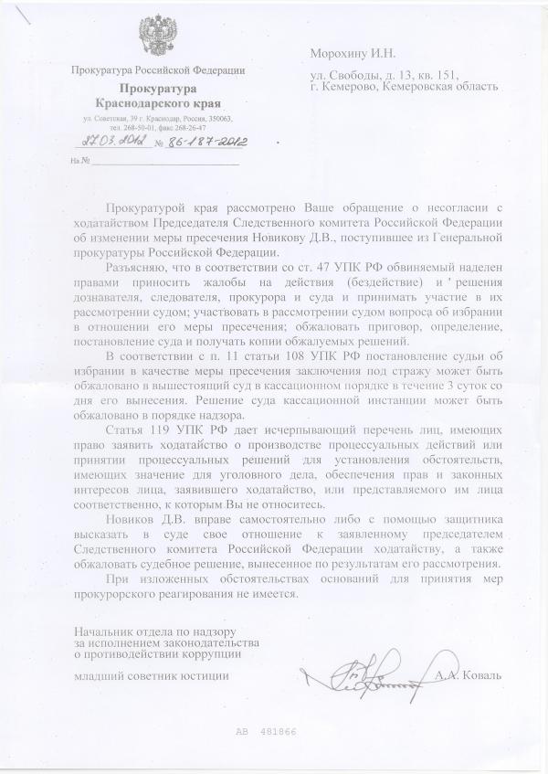 На обращение Морохина И.Н. о несогласии с ходатайством Председателя СК РФ об изменении меры пресечения Новикову Д.В., поступил ответ Прокуратуры Краснодарского края, следующего содержания: