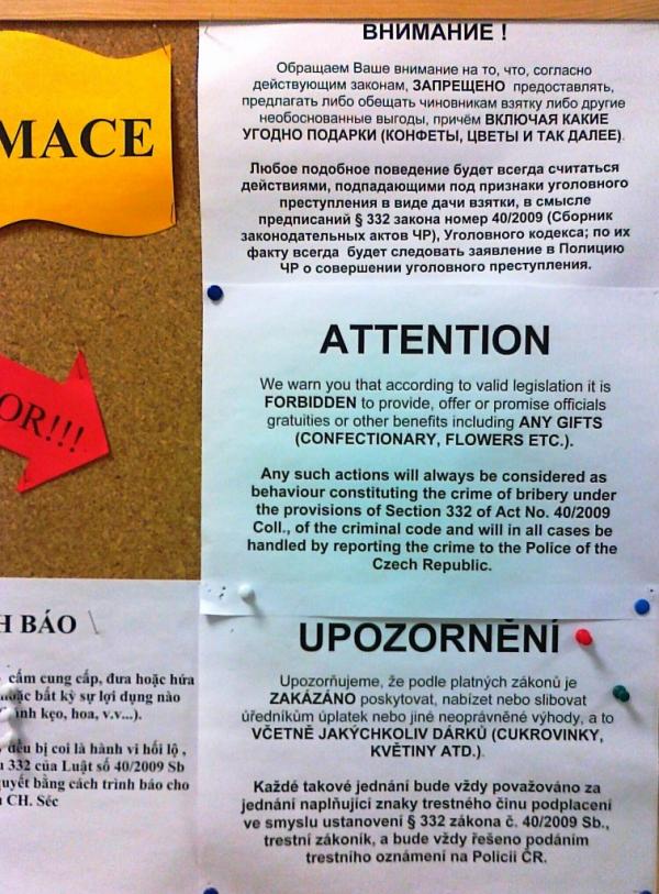 В связи с предложением автора декриминализировать «мздоимство» в нашем, «отдельно взятом» государстве, вспомнил объявление на трех языках к одном чешском учреждении: