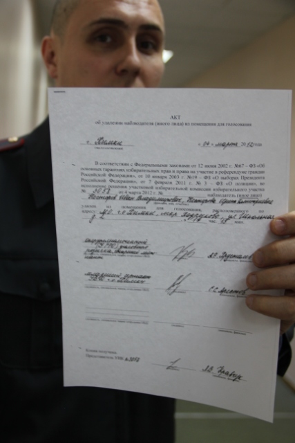 Для нашего удаления в УИК прибыли с десяток высоких и не очень чинов полиции и местной администрации. Был составлен акт, который нам удалось сфотографировать. Согласно этому акту, мы нарушили законы №67-ФЗ и №19-ФЗ, а также закон «О полиции». Конкретных ссылок на нормы законов не приводилось. Надлежащим образом заверенные копии акта нам выдать отказались. Полагаю, что незаконное удаление представителей СМИ с участка — это серьезное нарушение, предполагающее уголовную отвественность по ч. 2 ст. 144 УК РФ. Видео тут.
