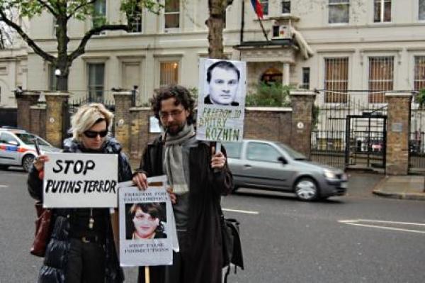 Пикет солидарности с Дмитрием Рожиным 9 апреля 2012 в Лондоне напротив посольства РФ: