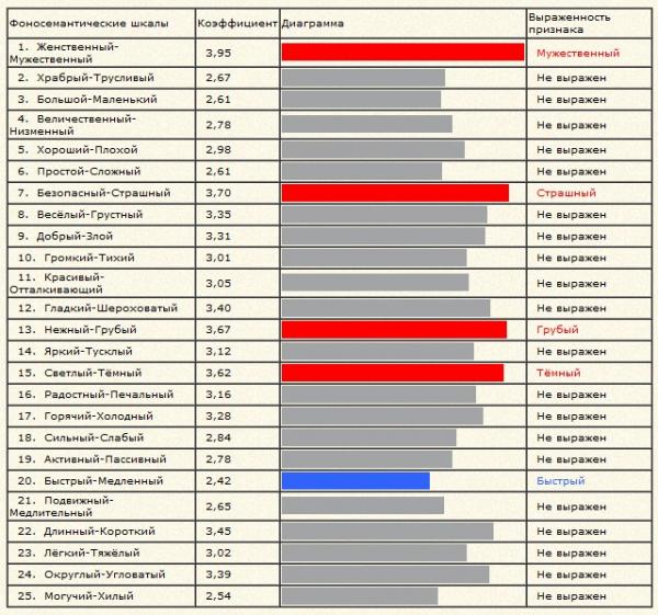 В данной таблице приводится весь спектр фоносемантических шкал cо значениями проанализированного слова по каждой шкале. В графе коэффициент необходимо учитывать следующие позиции: если коэффициент < 2,5 выражен первый признак шкалы; если коэффициент > 3,5 выражен второй признак шкалы, если он находится в промежутке 2,5 — 3,5 то по этой шкале выраженности нет.
