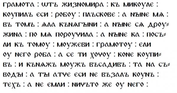 «Грамота от Жизномира к Микуле. Ты купил рабыню во Пскове, и вот меня за это схватила (подразумевается: уличая в краже) княгиня. А потом за меня поручилась дружина. Так что пошли-ка к тому мужу грамоту, если рабыня у него. А я вот хочу, коней купив и посадив [на коня] княжеского мужа, [идти] на очные ставки. А ты, если [еще] не взял тех денег, не бери у него ничего.»