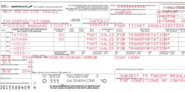 Что касается пассажирского билета и багажной квитанции (в виде нескольких склеенных листочков на русском и английском языках), которые мне выдали в аэропорту г. Иркутска после прохождения регистрации, то они, в отличие от электронного билета, не содержали неопределенности.