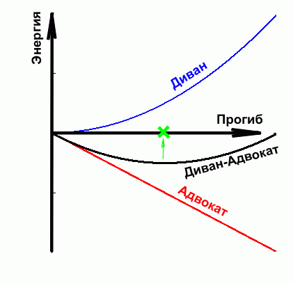 Мир, в котором мы живем, устроен так, что в любом процессе затрачивается наименьшее возможное количество энергии. Сел, например, адвокат на свой диван. И диван среди бесконечного числа возможных форм немедленно примет ту, которая обеспечивает минимум «полной» энергии системы «адвокат-диван». Поясним это, полагая для простоты, что диван подобен пружине, а пружина обладает таким свойством, как жесткость. Тогда энергия деформации дивана пропорциональна жесткости, умноженной на прогиб дивана в квадрате. Это выражается параболой на рисунке. Адвокат, сев на диван, уменьшил свою потенциальную энергию, так как его центр тяжести переместился вниз. Тогда величина уменьшения потенциальной энергии пропорциональна массе адвоката, умноженной на величину прогиба дивана. Это выражается прямой линией на рисунке. Просуммируем параболу и прямую, то есть для каждой величины возможного прогиба дивана вычислим сумму соответствующих значений энергии. Получается парабола с явным минимумом. Это и есть истинная величина прогиба, так как она соответствует минимуму полной энергии системы диван-адвокат!