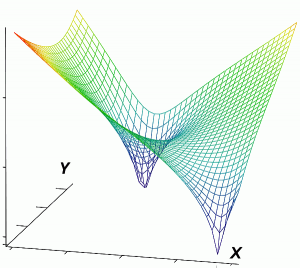Итак, для каждой из 1353 исследованных возможных точек столкновения получено 1353 возможных значения величины затрат кинетической энергии на деформацию автомобилей. Нанесем полученные результаты на график в виде изолиний уровня так же, как это делают на географических картах для возвышенностей и впадин. Результат показан ниже на рисунке. А для лучшего восприятия «возвышенности и впадины» показаны ниже на трехмерном графике. Трехмерный график немного похож на график «диван-адвокат», рассмотренный выше, но отличается более узкой областью минимума.