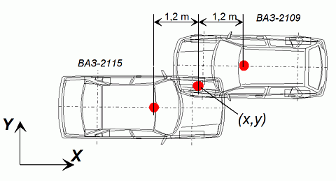 1. Если столкновение автомобилей произошло в некоторой точке (x,y) из исследуемых 1353 точек, то координаты центра тяжести автомобиля ВАЗ-2115 могут быть найдены из масштабного макета на рисунке. Абсцисса его центра тяжести это x-1.2, а ордината y-0.5. Аналогично, для ВАЗ-2109 координата центра тяжести (x+1.2, y+0.5).