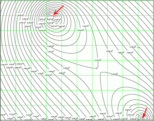 Поддержать Лагранжа можно прямым сравнением величины энергии на графике в области левой стрелки на рисунке с теми самыми 400000 Дж, которые определены в п.3 выше. Энергия деформации больше, или существенно больше, 400000 Дж – это уже не реально. А на графике видно, что изолиния вокруг минимума соответствует 600000 Дж. Из трехмерного графика видно, что узкое «горлышко воронки» на графике энергии уходит вниз, и где-то там есть уровень 400000 Дж. Но размер «горлышка» так мал, что нет необходимости проводить дальнейшее исследование.