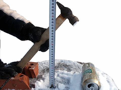 Критерий истины – эксперимент. Возьмем в качестве объекта эксперимента алюминиевые консервные банки из-под пива. В качестве деформирующего объекта нам понадобится молоток, а в качестве измерительного прибора – рулетка или линейка. На конце деревянной ручки молотка просверлим отверстие, чтобы молоток мог вращаться, как маятник. Теперь все готово к эксперименту.
