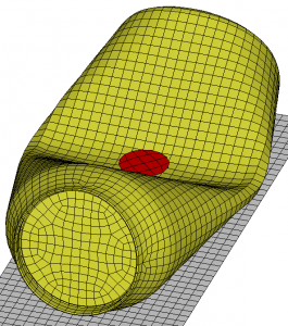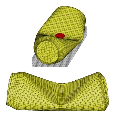 Сравнивая то, что получилось с фотографиями трех банок, удовлетворенно отметим, что совпадение очень хорошее. Затраты энергии, которые рассчитал компьютер, составили 1.41 Дж. Чуть меньше, чем 1.44 Дж, но в расчете не было учтено деформационное упрочнение материала. Но все равно – погрешность копеечная! Поэтому, проведя несложный расчет, получаем, что наш молоток упал на банку с высоты не меньше 265 мм, а не 270 мм, как в эксперименте. А как же ДТП, спросит читатель. А точно так же! Измеряем деформацию основных силовых элементов автомобиля, делаем конечно-элементный аналог этих элементов и производим расчет.