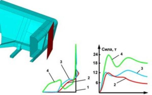 Как ученый-прочнист, я, видимо, должен благодарить Вас за идею разной жесткости конструкции автомобиля в разных местах. Но, увы, не буду, так как это давно известно. Вот фрагмент моего доклада от 2008 года, где я наглядно это показываю. Здесь показана левая часть автомобиля перед ударом в столб квадратного сечения. Слева на виде сверху 1 – исходная форма левой части автомобиля, 2 – деформированная форма при ударе внешним краем, 3 – деформированная форма при ударе между внешним краем и лонжероном, 4 – деформированная форма при ударе лонжероном. Справа – соответствующие расчетные графики зависимости сил от деформации. Подробнее – здесь. И сломанный или гнутый столб мы умеем считать, и удар торпеды в борт вражеского судна, и многое другое, не сомневайтесь. :)