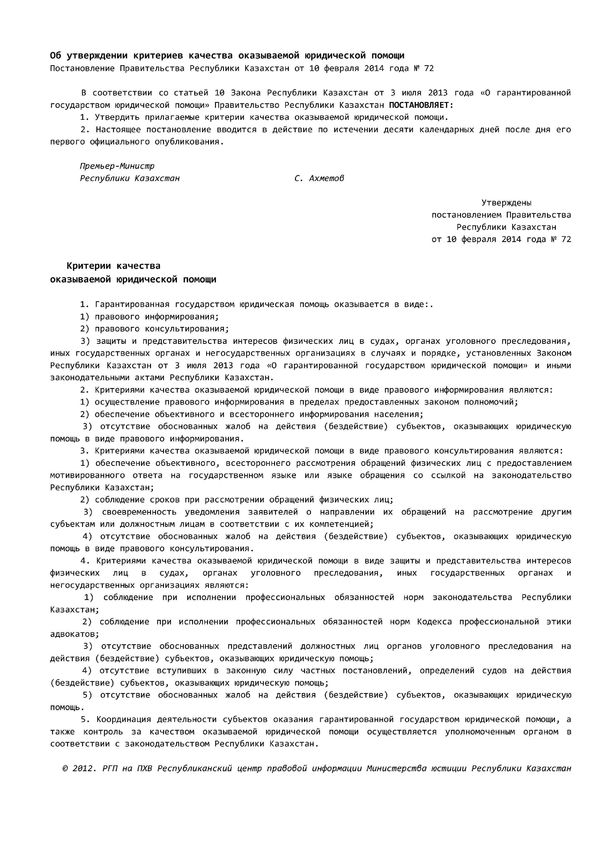 Так, Постановлением Правительства Республики Казахстан от 10 февраля 2014 года № 72 «Об утверждении критериев качества оказываемой юридической помощи», определены виды гарантированной государством юридической помощи: правовое информирование; правовое консультирование; защита и представительство интересов физических лиц в судах, органах уголовного преследования, иных государственных органах и негосударственных организациях в установленных случаях и порядке.