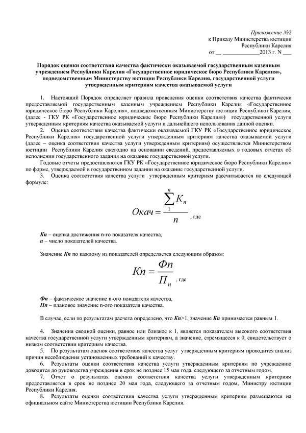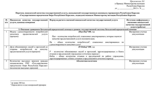 Возможно, будет интересно ознакомиться с Перечнем показателей качества государственной услуги, оказываемой государственным казенным учреждением Республики Карелия «Государственное юридическое бюро Республики Карелия», подведомственным Министерству юстиции Республики Карелия, а также с Порядком оценки соответствия качества фактически оказываемой государственным казенным учреждением Республики Карелия «Государственное юридическое бюро Республики Карелия», подведомственным Министерству юстиции Республики Карелия, государственной услуги утвержденным критериям качества оказываемой услуги.