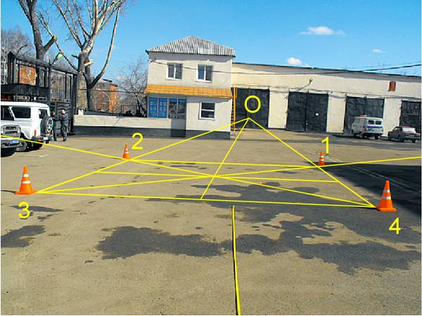 На фотографии ниже до боли знакомый многим кемеровчанам уютный полицейский дворик, где на расстоянии 6.45 м друг от друга установлены сигнальные конусы. Желтые линии и номера конусов нанес на фотографию автор. В квадрат, ограниченный конусами, кто-то из кемеровских полицейских любезно бросил пачку сигарет. Марку, к сожалению, не указали, но видно, что пачка красная с белым. Расстояние от конуса №2 до пачки сигарет было измерено, и составило 600 см. Эту задачу нам и требуется решить – измерить расстояние от конуса №2 до пачки сигарет.