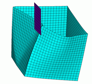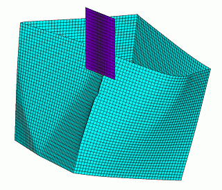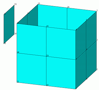 У нашей коробки 5 квадратных граней – 4 стороны и дно, а верх открыт. Слева – жёсткая неподвижная стенка, в которую потом ударится наша коробка. Мысленно разобьём каждую грань на четыре части, и назовём каждую часть элементом, а углы элемента – узлами. Рассмотрим один простейший элемент с узлами A, B, C и D. Положим, что линии AB, BC, CD и DA – это прямые и всегда останутся прямыми. Если расстояние между линиями, например, AB и CD увеличится, то получаем растяжение нашего элемента, а уменьшится – сжатие. Так же легко представить себе кручение в виде закручивания линии, например, AB относительно CD, или сдвиг как перемещение линии AB вдоль неё самой относительно линии CD. Всё, что мы можем проделать с простейшим элементом, называется испытаниями, а все испытания материалов давно ГОСТированы. Поэтому силы, возникающие в узлах A, B, C и D при том или ином испытании или их сочетаниях, для каждого материала легко определяются, и соответственно, легко определяется величина затраченной энергии.