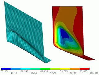 Замечаем, что разница расчётных затрат энергии между двумя последними расчётами не превышает 2%. Такой точности вполне достаточно, дальше измельчать сетку элементов нет необходимости, и расчёт закончен. Заметьте, что последняя картинка здорово похожа на правду, даже зазубрины от края стенки отобразились на ребре! Теперь юристу должен быть понятен смысл конечно-элементного расчёта – объект в конкретных условиях деформируется не как попало, а так, что среди возможных его деформаций (изменений формы), какие только можно и нельзя себе вообразить, находится такая, которая обеспечивает минимум полной энергии системы объект-препятствие.