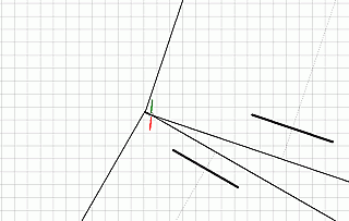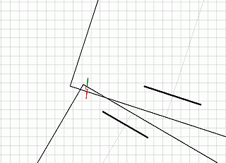 На рисунке выше показано расчётное движение пикапа и «шестёрки». Посмотрим на правый задний угол пикапа и передний правый угол «шестёрки» в более крупном масштабе. На рисунке ниже (размер координатной сетки 10см) показан момент наибольшего взаимного внедрения машин на глубину в пикап 7 см. Сверху контур задней части пикапа, снизу контур передней части «шестёрки». Зелёная линия – сила, скользящая вдоль кузова пикапа и действующая на пикап, красная линия – такая же сила, но действующая на «шестёрку».