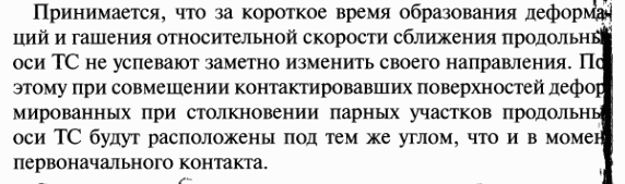 Увы, Владимир Николаевич, Ваш пример про Жигуль и Пикап не убедителен и представляет собой явный нонсенс, как мне кажется. Начать с того, что на Пикапе в зоне следового контакта с синеньким Жигулёнком есть обширная зона поросших мохом и плесенью иных повреждений (вмятин и складок) по которым прекрасно читается направление образовавшего их воздействия, явно НЕ совпадающее с направлением воздействия жигульского крыла. Не исключено, что такие же, мохом поросшие повреждения есть и на других частях кузова, якобы, от «опрокидывания» — ХА-ХА. Отвлекаясь от технической части, в этом просматриваются явные признаки криминальной инсценировки и мошенства — я вполне понимаю отказ СК. Что касается цитаты (из «Синей книги», кажется), то это — правда подтверждённая практикой, хоть и не вся правда. В рассматриваемом случае, о чём бы не говорили Вам расчёты, отбрасывание-то будет (было?), но воздействие на Пикап вполне сравнимо с наездом на выбоину или на некрупный камень — не с чужих слов знаю, а сам попадал в ДТП неоднократно! Это я к тому, что любой водила мигом компенсирует рулём последствия такого удара и никакого нарисованного Вами печального загиба траектории в кювет не произойдёт, если за рулём не труп. Что нету отпечатка (отображения) «трубы» — аналога противоподкатного бруса — тут Вы правы — для этого отбрасывания хватило бы, НО (!) отпечаток (отображение) конца указанной «трубы» на Жигулёнке ЕСТЬ! Чуть правее правого поворотника :)